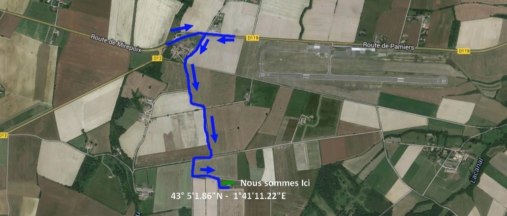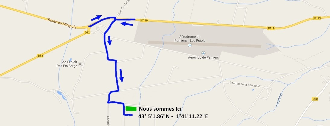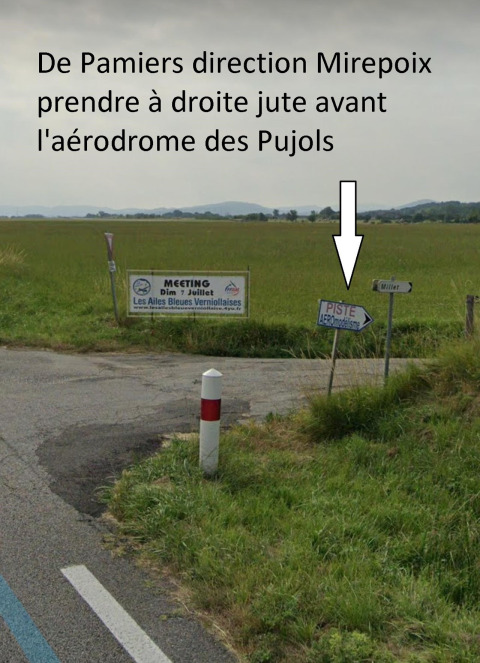 De Pamiers direction Mirepoix prendre à droite de suite après le virage avant aérodrome des Pujols (voir photo ci-dessous).